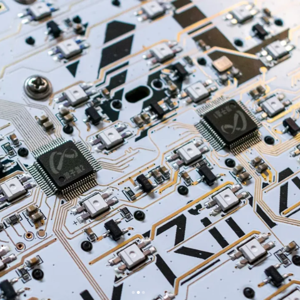 1.6 mm matte white PCB w/ black text; ENIG immersion gold; nano-coating for splash resistance, anti-static breakdown, overheat protection