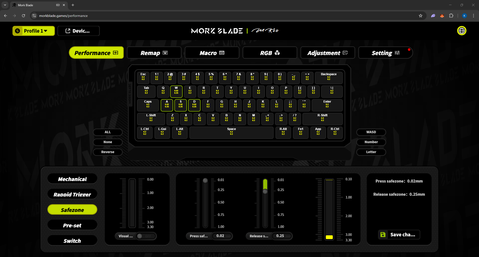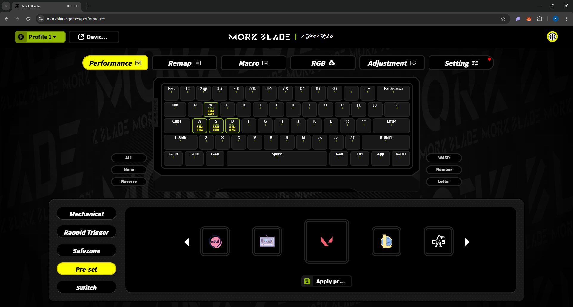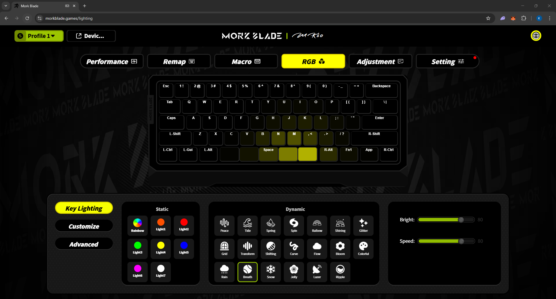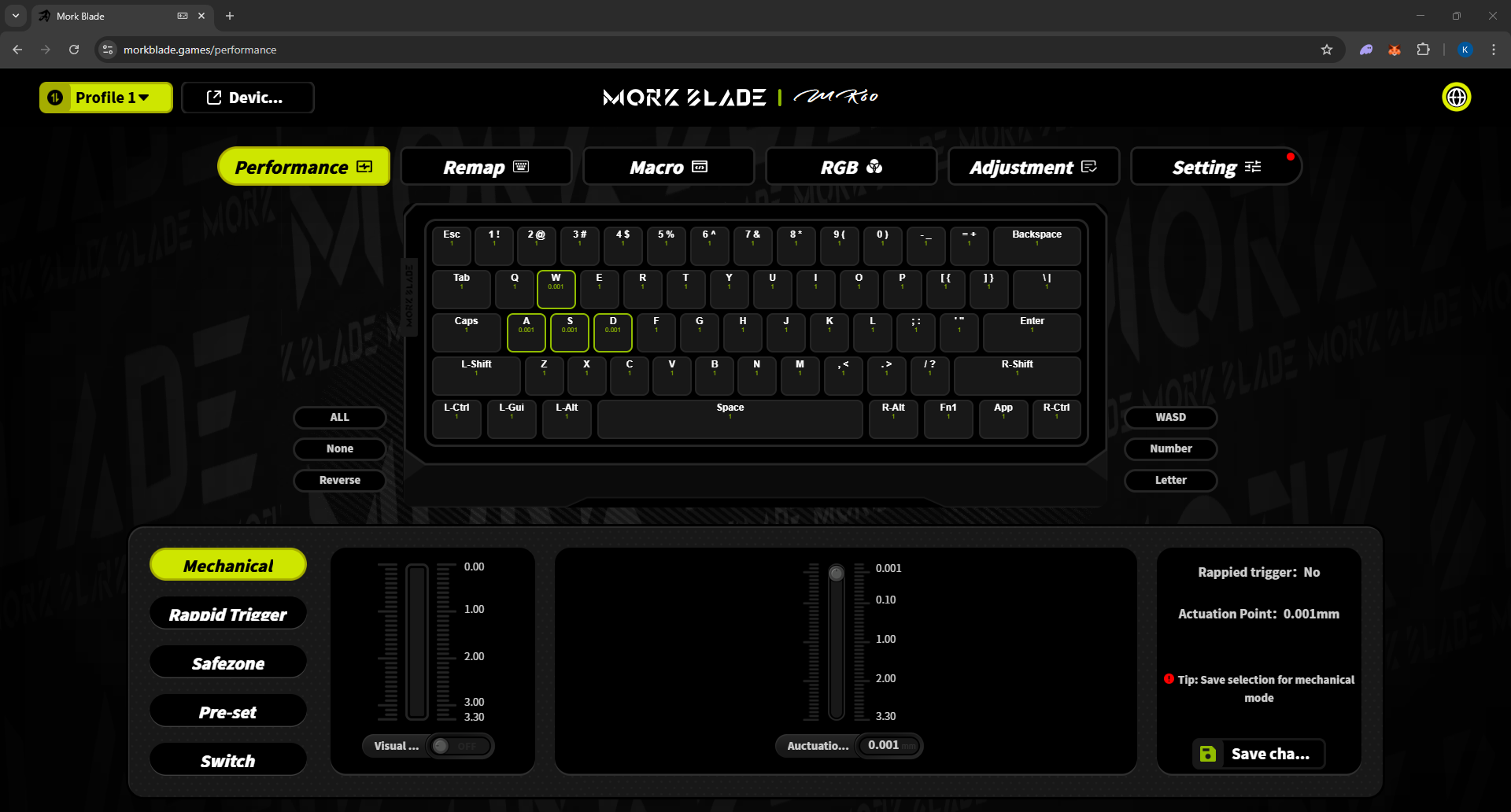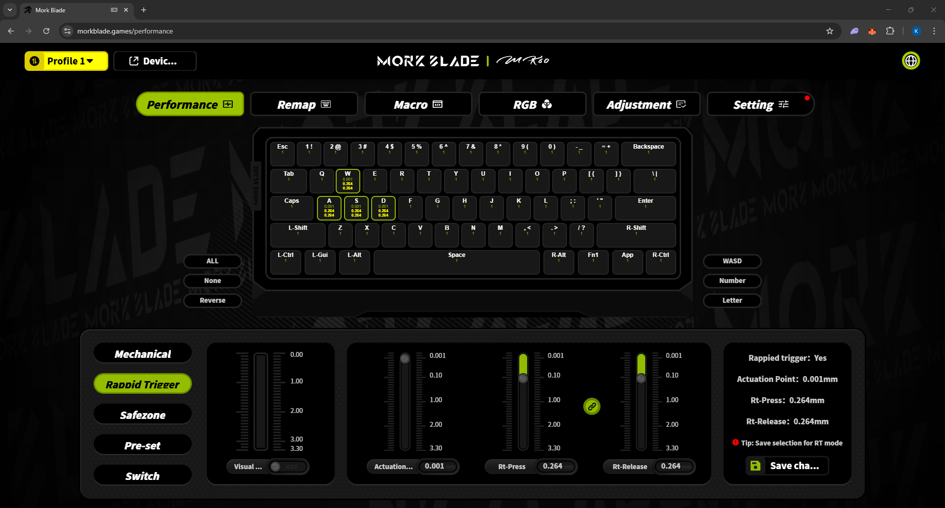 MorkBlade’s companion software allows per-key analog tuning, rapid-trigger sensitivity, and lighting synchronization.
